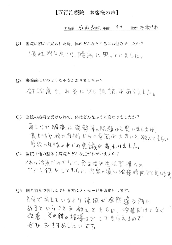 慢性的な肩こり、腰痛に悩んでいた石田秀政さん